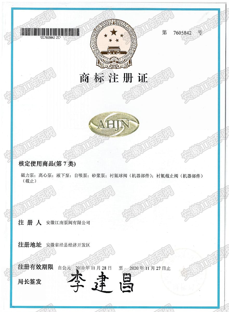 安徽江南泵閥有限公司榮獲磁力泵,離心泵,自吸泵,砂漿泵,液下泵,閥門商標注冊證,主營:氟塑料泵,不銹鋼泵,耐腐蝕化工泵,品質卓越,行業領跑企業,科研生產型企業20年鑄就行業輝...